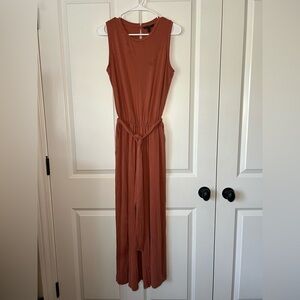 This chic jumpsuit from Banana Republic features a relaxed wide-leg silhouette and a fitted bodice with a round neckline. The rich rusty brown color and self-tie belt at the waist add a touch of elegance, making it perfect for casual office settings or everyday wear.