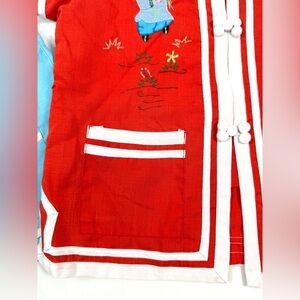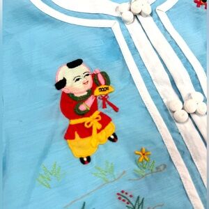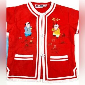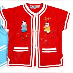 Vintage Chinese embroidered short-sleeve jackets in red and sky blue, each featuring intricate hand-stitched figures of traditional festival children holding fish kites and flowers. Mandarin collars with white frog button closures and front pockets. Made of polyester & cotton. Labeled size 2. Both are in beautiful vintage condition with minimal wear.