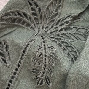 Cutwork, eyelet, linen, linen blend, resortwear, vacation outfit, summer outfit, brunch outfit, garden party, bridal shower, designer, luxury, belted waist, square neckline, smocked back, olive green, boho style, coastal, euro