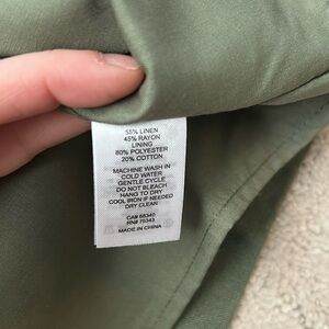 Beautiful linen blend fabric with intricate eyelet cutwork throughout. Fully lined so it is not sheer. Features a flattering square neckline, adjustable straps, smocked back panel for comfort, and removable belt with woven buckle.