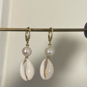 Gold Filled Pearl & Cowrie Shell Drop Earrings Boho Beach Coastal Wedding