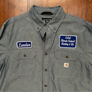 Carhartt Men's “Loose Fit” Blue Work Shirt, Lots of Patches, Size Large