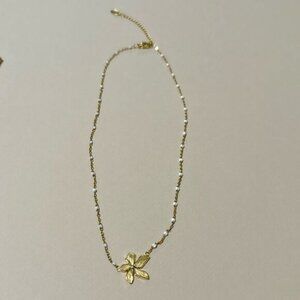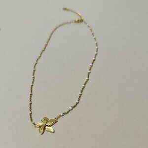 Boho pearl link chain flower necklace in gold tone hardware