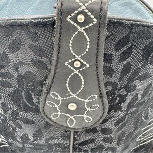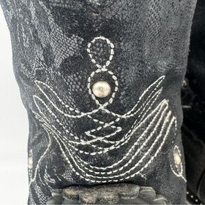 These stylish and comfortable boots feature decorative stitching, durable chunky sole, silver metal stud embellishments, round fatbaby toe and have a lacy, floral appearance on the short shaft. Rugged and fashionable for any work or play adventure. These boots have been well loved, obvious signs of wear on the soles, some scuffing on the leather (please see photos) but have lots of life left.
