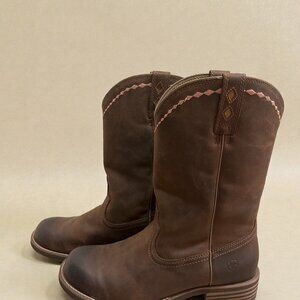 Ariat Women's Unbridled Roper round-toe Western boots in distressed brown full-grain leather with pink stitching detail.