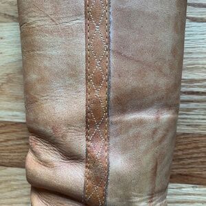Beautiful vintage saddle brown Frye tall leather boots with intricate western motif stitching.