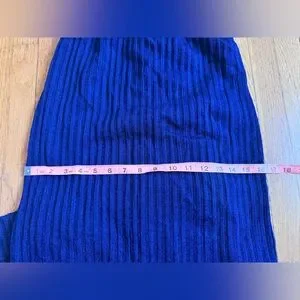 This is a gorgeous 1970s Vintage Perullo for Fred Perlberg knit dress. Made of a navy blue fabric, the dress has long sleeves and a high mock neckline with vertical ribbing throughout. The top of the dress has navy blue sequins and the waist has attached ties. Overall in good vintage condition - some of the sequins are losing their coloring. Zips up the back with a talon zipper. Has no size tags - measurements in line with a small to xs. Has stretch.