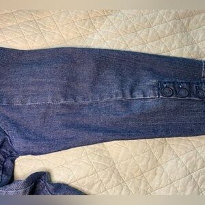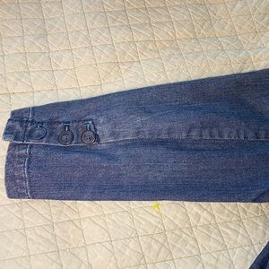 The denim jacket or blazer is by American Eagle Outfitters. The denim is lightly distressed. Nice button detailing on both sleeves.