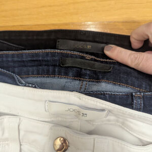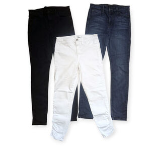 This listing features three pairs of Joe's Jeans skinny jeans: one black, one dark blue, and one white. Selling as a lot since each has a small flaw. Price is for all 3.