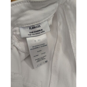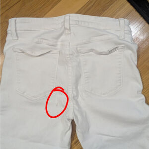 White: Cropped The Charlie, size 30, with ruched leg at calf. Flaw is small mark below back pocket - photo included. May clean up, haven't tried.