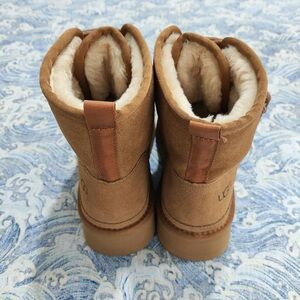 It's a short boot with a thick sole, double strap design with buckles, plush lining inside, and a pull tab at the heel.