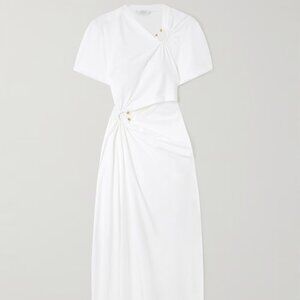 Rabanne finds new, fresh ways to work its signature metalwork into its collections every season. Cut from slinky jersey, this midi dress is loosely draped and accented with gold-tone rings that create cool cutouts.