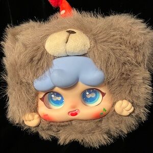 Adorable plush bear hat toy featuring soft blue eyes and a cute design.