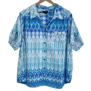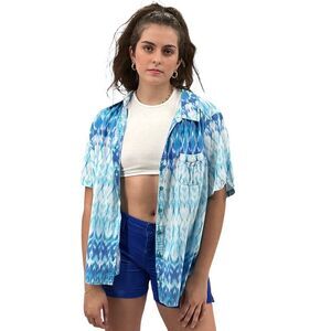 Oversized Camp Shirt Short Sleeve Button Up Blue White Ikat Print | Small/Medium