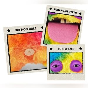 Brand new in box. Meet Cheeky Chonky, the mischievous rainbow guinea pig from the Butt Ugly Pets Fuggler collection! Known for its bright rainbow fur, purple eyes, and massive tongue, this chaotic critter brings equal parts charm and mayhem. With disturbingly human-like teeth and plush softness, Cheeky Chonky is ready to wreak havoc while pretending to be cute.