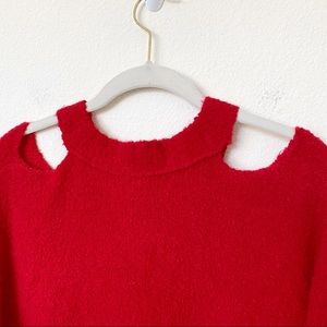 Stylish red crew neck sweater. Features a trendy shoulder cut-out. Soft and cozy material.