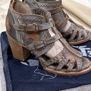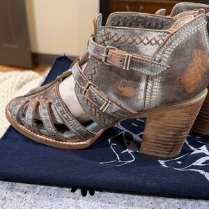 Chic distressed heels with cutout details. Combines gray and brown hues. Approximately 3” block heel for all day comfort. Two adjustable straps, silver stud detail across toe area. Zip back. See photos for condition and details. See second photo for best photo true to color.