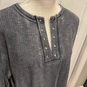 Project Social T thermal henley in a gray or charcoal waffle knit fabric. This style features a V-neck henley design with a button placket. Distressed look with raw-style edges at the cuffs and hem, which is intentional for a vintage aesthetic.