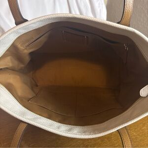 Elegant Coach shoulder bag. Beige canvas with black and white stripes. Perfect for any occasion.