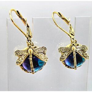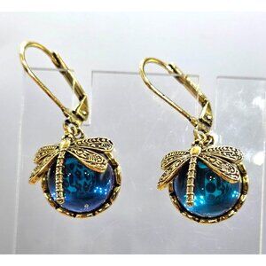 Whimsical and elegant earrings feature intricate gold dragonfly designs paired with shimmering blue glass cabochons. Lightweight and comfortable for all-day wear.