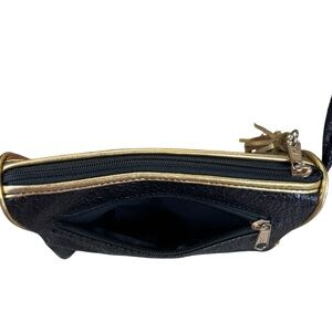 • Features: Zip-top closure, tassel pull, gold piping, grommet strap channel