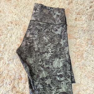 Lululemon high-rise tights in black. Features a sleek design with a subtle pattern.