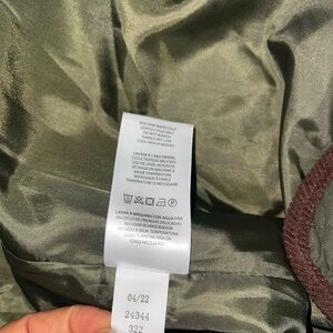 Chic olive quilted puffer. Features brown trim and collar. Ideal for warmth and style.