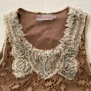 Pretty Angel boho layered crochet tunic top size S ruffle lace bottom sleeveless embroidered flower neckline, brown.