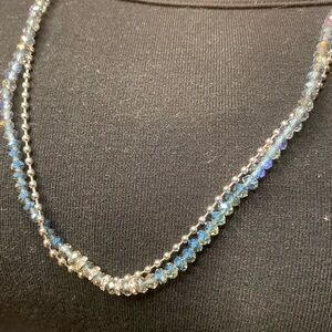 Multi-layered wrap bracelet/necklace features a blend of blue silver, and iridescent beads, perfect for adding a touch of elegance to any outfit. Can be worn as a necklace as well. Custom sizing. Once it is fitted to your wrist or neck you can remove the extra sizing holes. Good for elevating a more casual outfit. From the brand Chloe and Isabel which is no longer around. Hard to find jewelry piece.