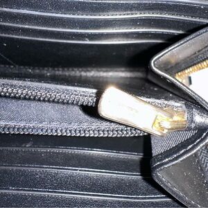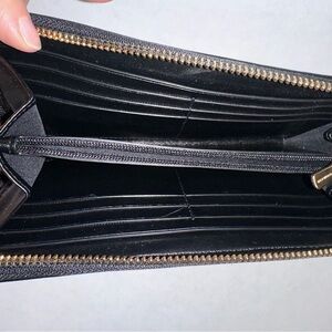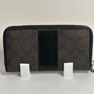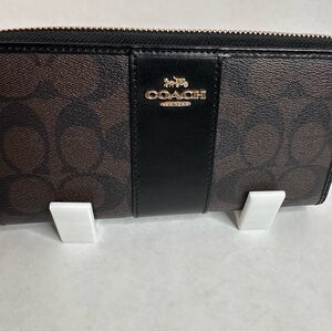 Elegant Coach wallet with signature pattern. Features a zip closure and sleek design.