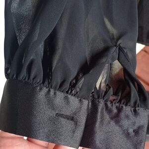Sophisticated black blouse. Features stylish sheer sleeves. Ideal for formal occasions.
