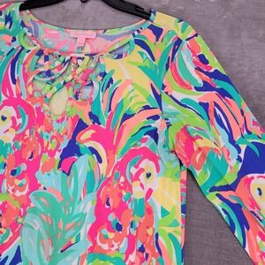 Keywords: Lilly Pulitzer dress, parrot print dress, long sleeve dress, colorful dress, keyhole neckline, womens dress, tropical print, designer dress, casual dress, party dress, vacation dress, resort wear, size M, medium dress