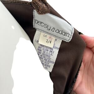 Stunning vintage 90s/Y2K Betsy & Adam maxi length sheath prom dress in a size 3/4. The color is a gorgeous bronze. The fabric has metallic shimmery flecks throughout. It features an empire waist accented by jewels with a sheer cutout behind. This dress is in perfect preowned condition with no issues or signs of wear. Size 3/4, modeled on a size 6 mannequin.