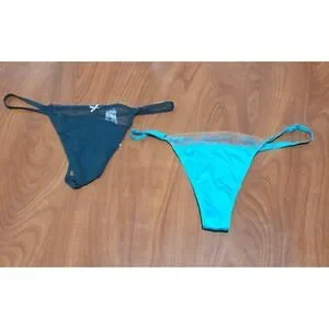 The product is a set of two Victoria's Secret thongs in the Very Sexy embroidered mesh and cotton V-string style. These panties feature a polka dot and solid pattern in aqua and green colors, made from a blend of polyester, polyamide, cotton, modal, and elastane. They have a low rise and adjustable waist compression area, with accents like a bow, embroidery, and the Victoria's Secret logo. These thongs are machine washable, lightweight, breathable, and opaque, perfect for everyday wear. Made in Sri Lanka, they come in a size small and are designed for regular size women.