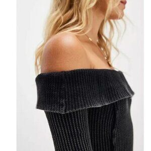 ▪ Features: Waffle-knit fabrication, off-the-shoulder neckline with folded detail, exposed seams throughout, long-sleeves with exaggerated cuffs, raw hem