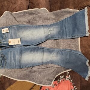 Trendy light blue jeans with a flare cut. Features distressed details and frayed hems. Perfect for casual wear.