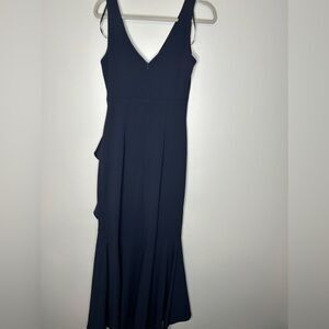 Size 6. Navy. Still selling full price at Nordstrom:$249. Flowing folds of fabric cascade along the side of a V-neck gown before ebbing into a distinctive high-low hem that subtly shows off your shoes.