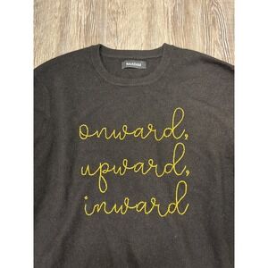 Infuse your wardrobe with motivation wearing this striking NAADAM sweater. The classic black crew neck silhouette provides a versatile canvas for the vibrant yellow embroidered phrase 'onward, upward, inward', offering a daily dose of inspiration with every wear. This piece is perfect for adding a touch of thoughtful style to your casual ensembles or layering for a cozy yet empowering look. Embrace mindful fashion for your daily adventures or peaceful moments at home.