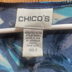 Stylish faux wrap blouse with abstract blue design. Features three-quarter sleeves. Ideal for chic casual wear.