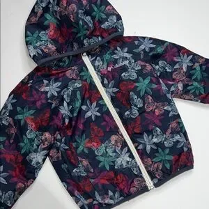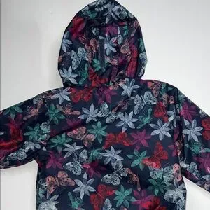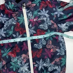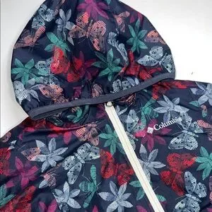 Vibrant Columbia jacket with floral pattern. Features a hood and zip closure. Fleece-lined windbreaker