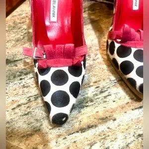 Manolo Blahnik Black and Pink Polka Dot Heels/ Pony Hair Vintage