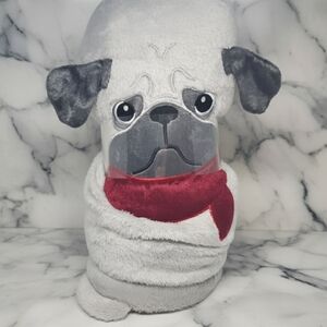 Cozy and adorable plush dog blanket featuring a cute pug design. Perfect for keeping your pet warm and comfortable. The blanket comes in a stylish gray and red color combination.