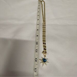 Elegant gold necklace featuring a striking blue heart pendant. Perfect for adding a touch of sophistication to any outfit.