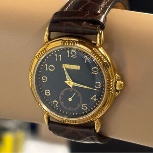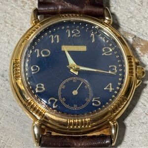Make a statement when wearing this vintage (but new!) Fossil ladies watch! Subtle, sophisticated and classic- this Fossil Watch is made with genuine leather, has a gorgeous navy face with gold bezel and accents.