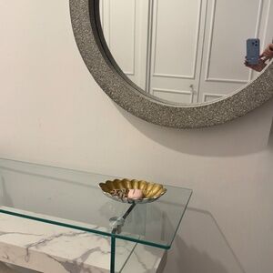 30” round mirror with terrazzo frame. High-quality construction, hangs flush and feels super solid. Bought for $399. Excellent condition. Comes with sturdy hardware for hanging.