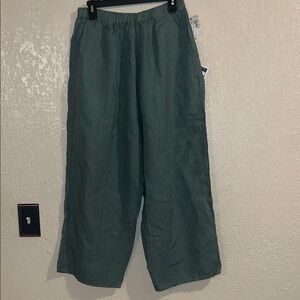 Chic olive green 100% linen wide leg pantsuit by Flax. Perfect for any occasion.
