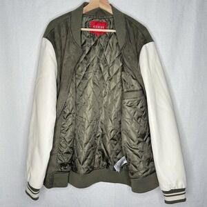 Guess Varsity Bomber Jacket Mens XL Olive Green Faux Suede Leather Logo Trap