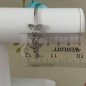 This 14K Silver Gold Plated Women's Bangle features a round cubic zirconia gemstone as the main stone. The hinged closure makes it easy to wear on various occasions such as Mother's Day, Christmas, weddings, anniversaries, birthdays, and Valentine's Day. The bangle style bracelet is crafted with white gold filled metal and nickel-free features for a comfortable and stylish accessory. With a flower-shaped main stone and prong setting, this high-quality piece exudes beauty and elegance, making it a perfect gift for any special occasion.