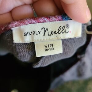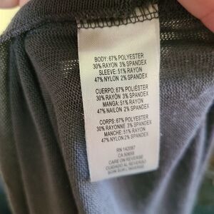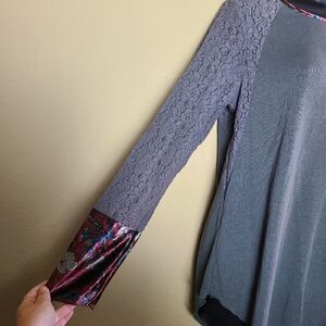 This is a long sleeved grey top by Simply Noelle. The cuffs have red floral print velvet accents and the sleeves are sheer with floral lace detailing. Note the small pull on the back as shown in photo 6.