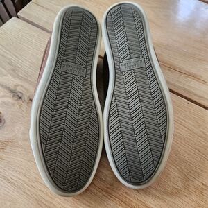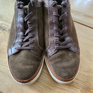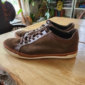 These Allen Edmonds suede sneakers are in excellent pre-owned condition. They have dark brown suede uppers with leather trim. Size mens 11.5 D.